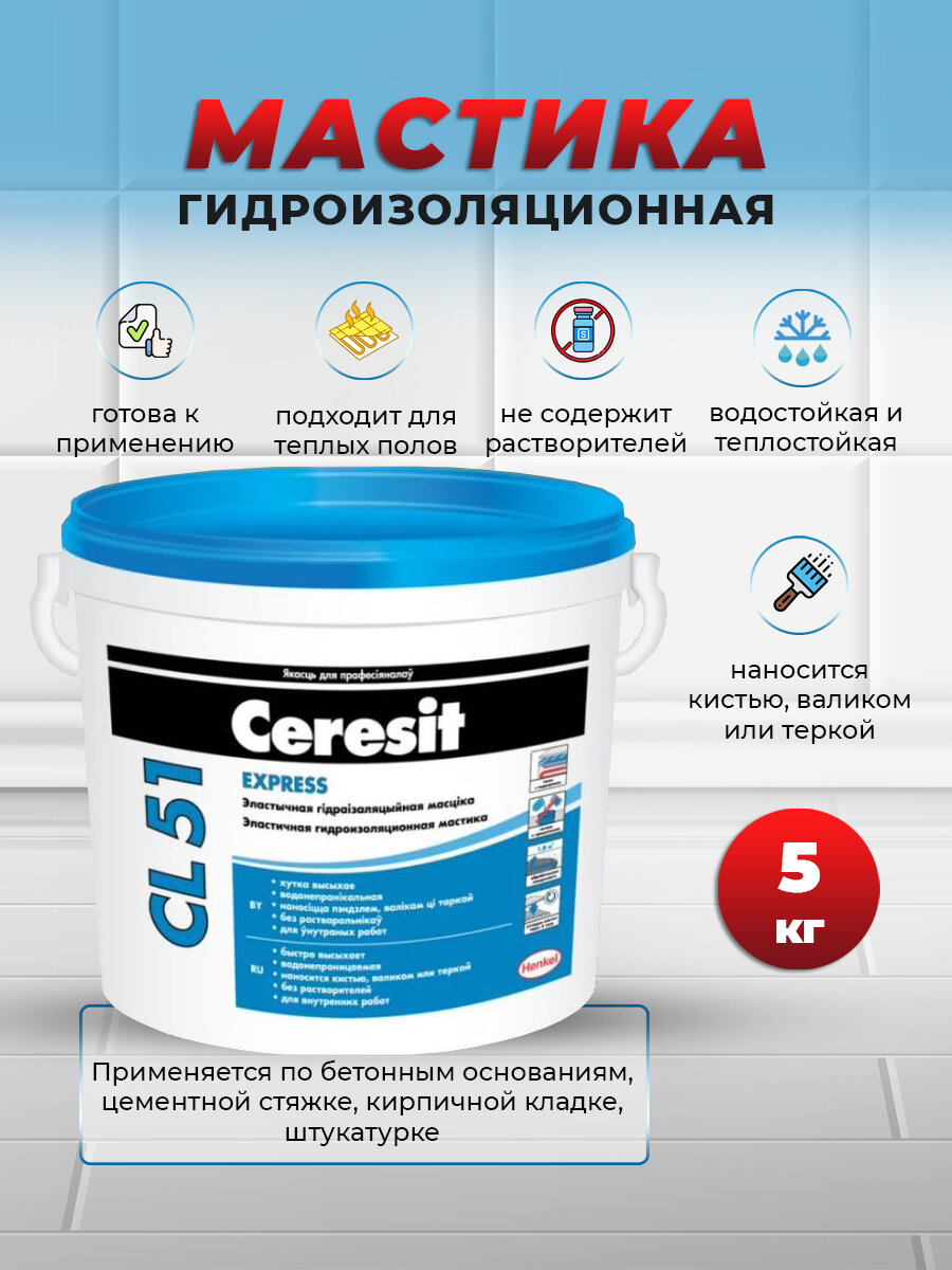 Гидроизоляция Ceresit CL 51, мастика полимерная, эластичная, 5 кг