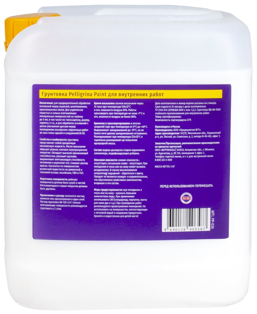 Предприятие ВГТ ООО Грунтовка проникающая для внутренних работ Pelligrina Paint, акриловая, 5 кг