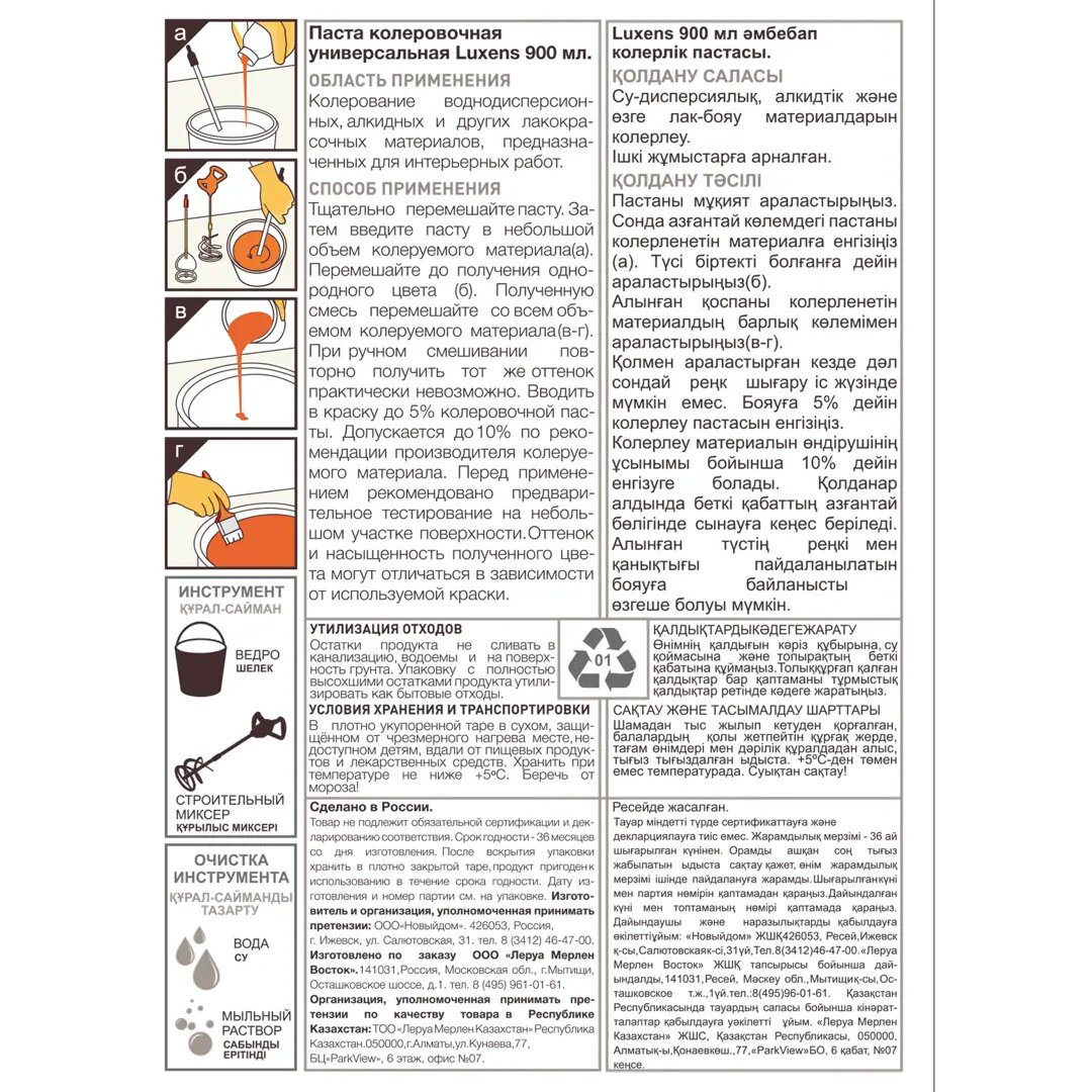 | Вид колера | колеровочная паста |