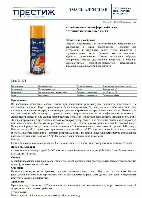 Ниже Вы можете прочитать отзывы на Аэрозольная алкидная краска Престиж, высокоглянцевая, 425 мл, красная, ознакомится с подробными характеристиками, посмотреть интересные обзоры и фотографии на Аэрозольная алкидная краска Престиж, высокоглянцевая, 425 мл, красная.