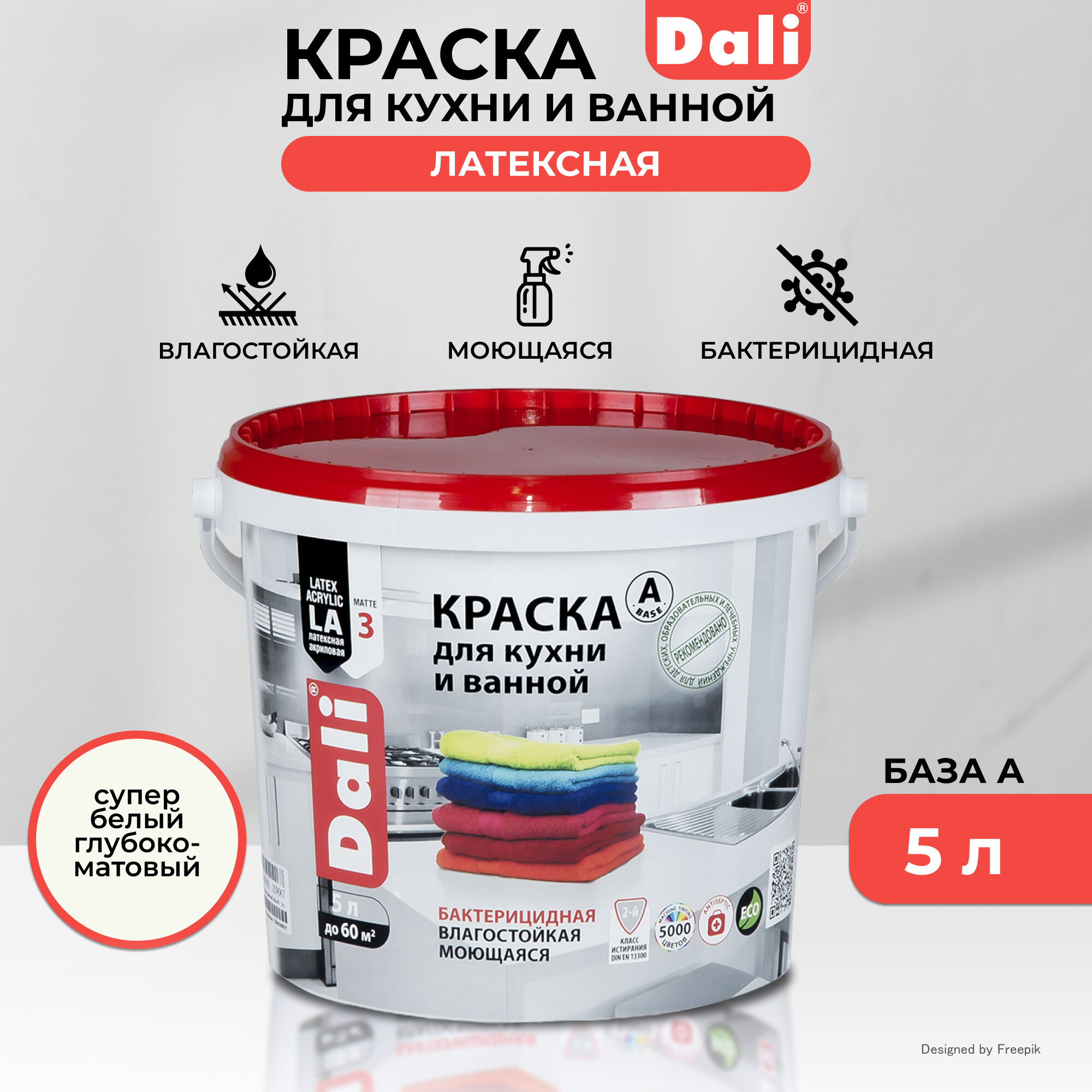 Краска для кухни и ванной Dali, латексная, глубокоматовая, база A, супербелая, 5 л