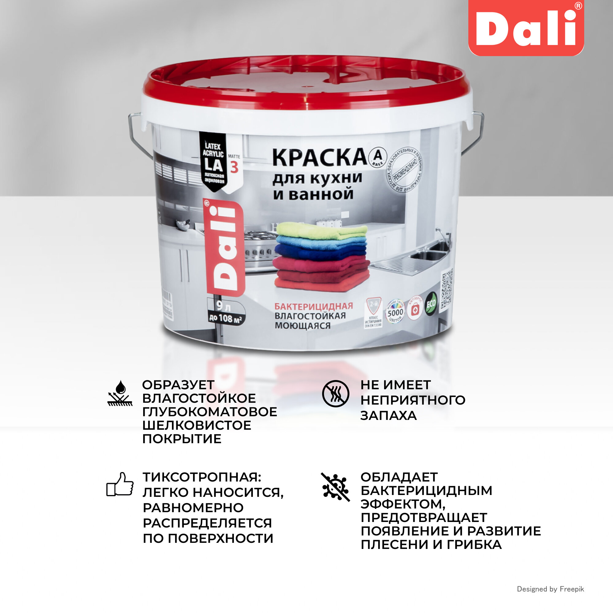 Краска для кухни и ванной Dali, латексная, глубокоматовая, база A, супербелая, 2,5 л