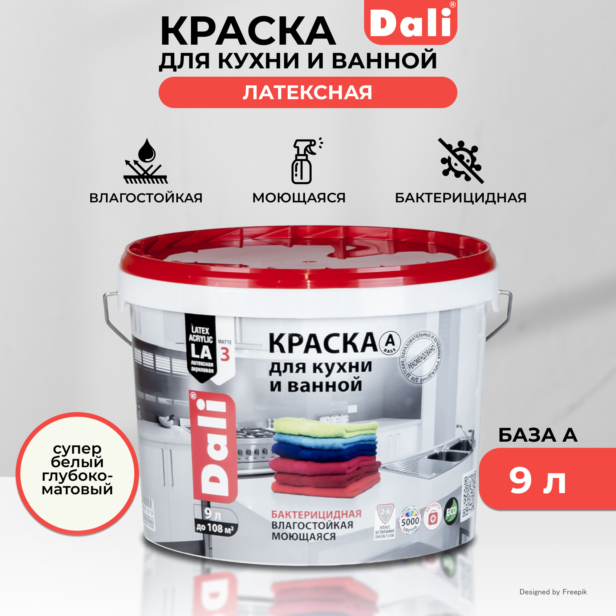 Краска для кухни и ванной Dali, латексная, глубокоматовая, база A, супербелая, 9 л