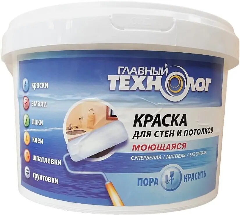 Краска для стен и потолков моющаяся Главный Технолог, матовая, супербелая, 1,4 кг