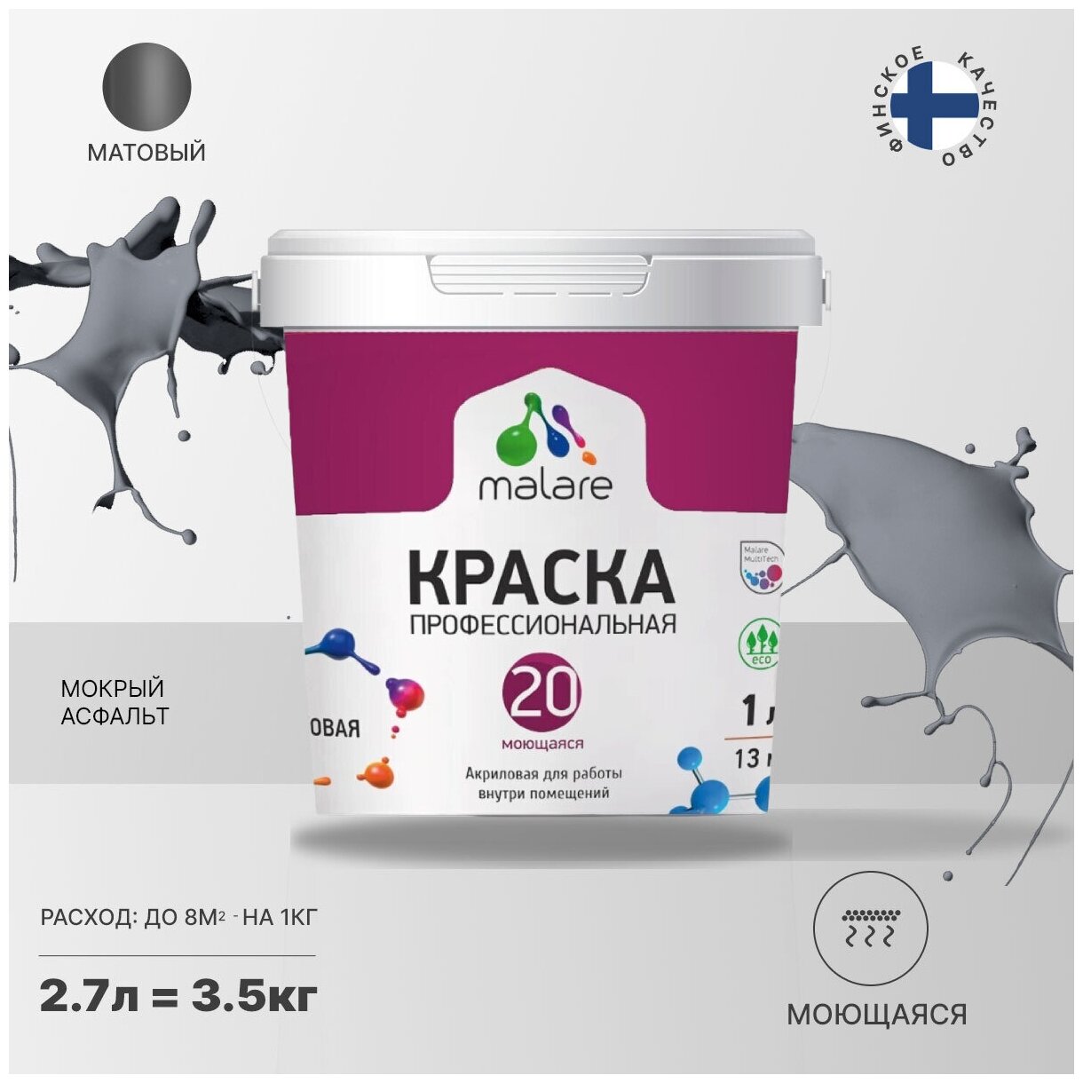 Краска Malare Professional Евро №20 для стен и обоев, потолка, деревянных и минеральных поверхностей, интерьерная, акриловая универсальная, быстросохнущая моющаяся без запаха матовая, мокрый асфальт, (1л - 1.3кг)