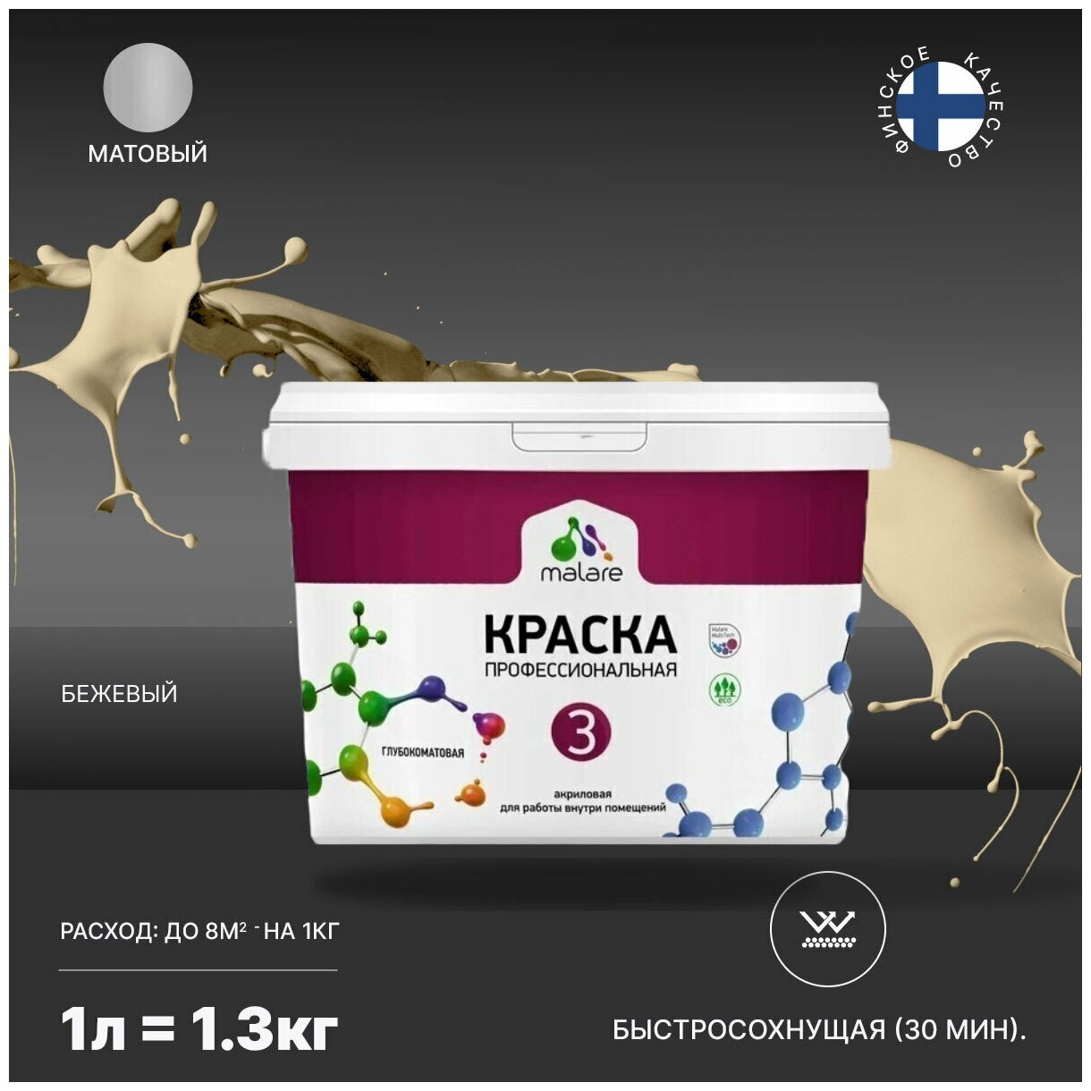 Краска Malare Евро №3 для обоев, стен и потолков, интерьерная, быстросохнущая, без запаха, матовая, масло тмина, (9л - 13кг)