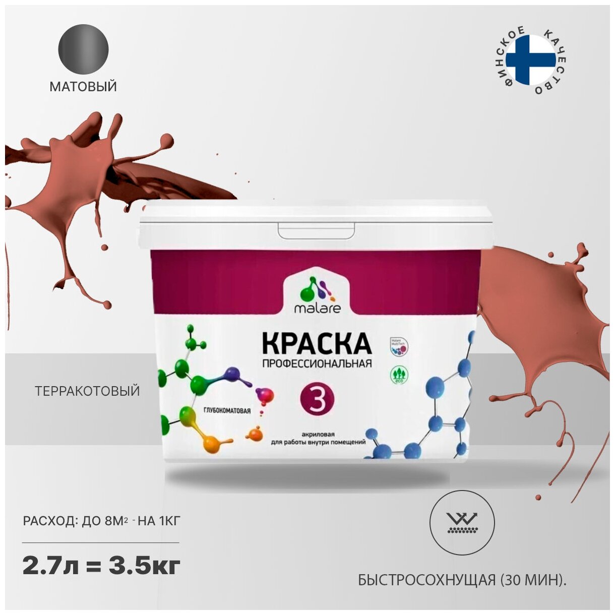 Купить Краска Malare Евро №3 для обоев, стен и потолков, интерьерная, универсальная, быстросохнущая, без запаха, матовая, терракотовый, (2.7л - 3.5кг).