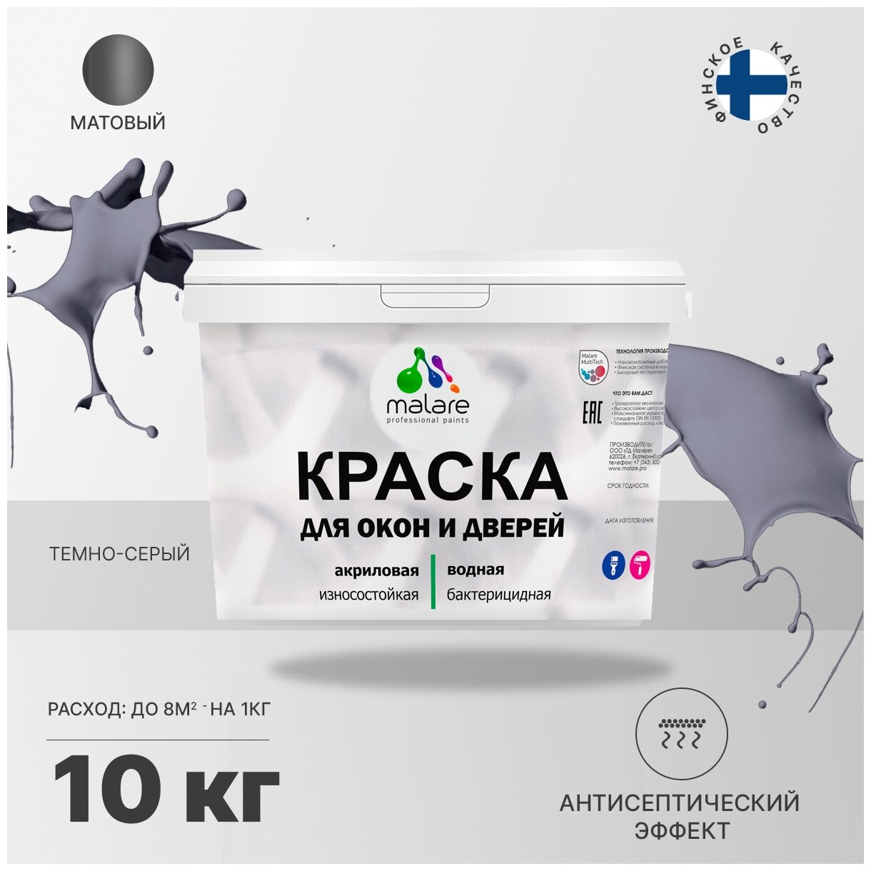 Купить Краска Malare для окон и дверей, оконных рам и межкомнатных дверей, по дереву, для любых деревянных поверхностей, с антисептическим эффектом, матовая, темно-серый, 10 кг.