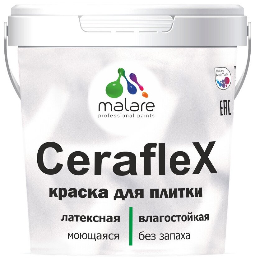 Краска резиновая Malare Ceraflex для керамической плитки, кафельной плитки, стен в кухне и ванной, эластичная моющаяся, быстросохнущая, без запаха, матовая, белый, 2 кг.