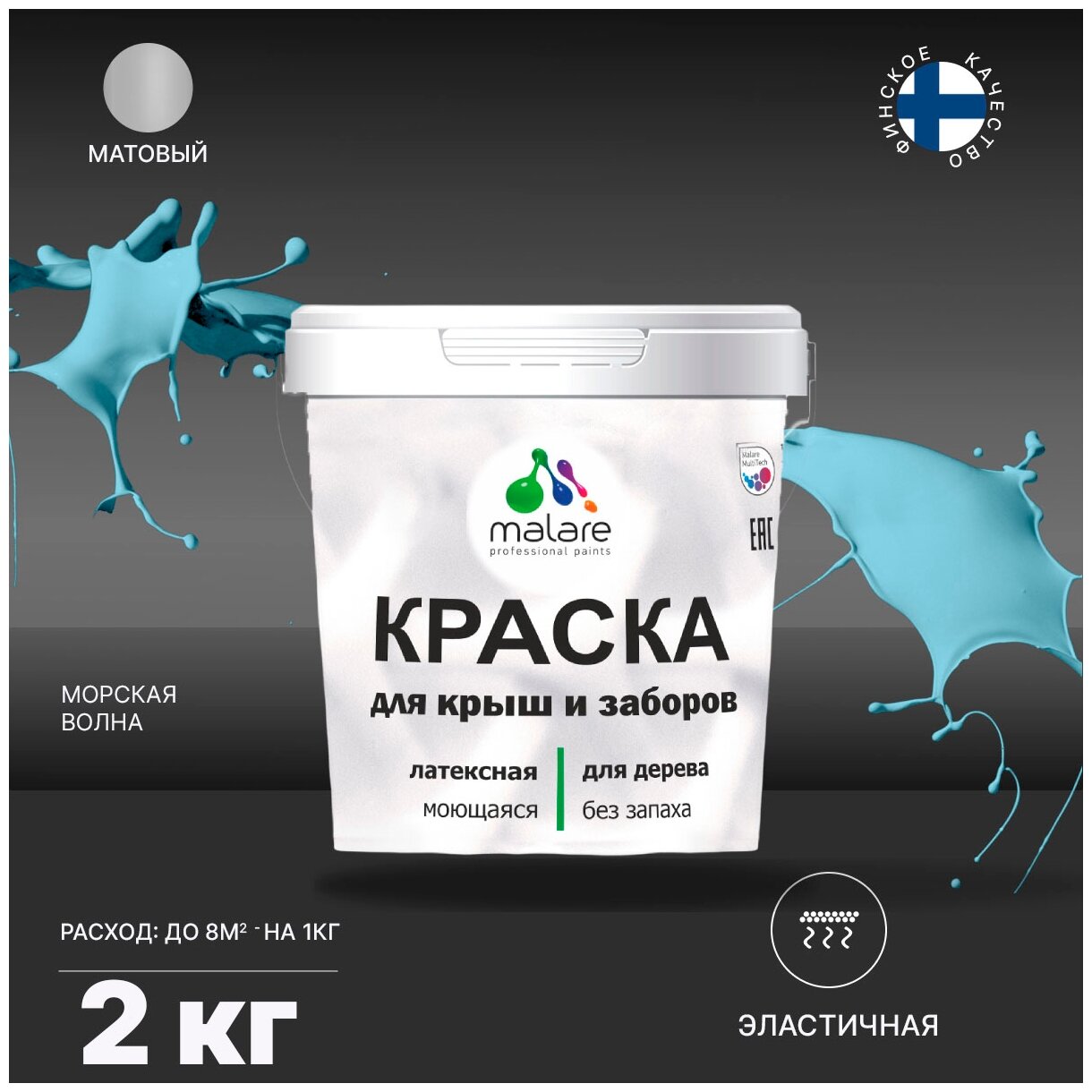 Краска Malare для деревянного забора, для крыши из шифера, для деревянных и минеральных поверхностей, с антисептическим эффектом, быстросохнущая, без запаха, матовая, голубая ель, 2 кг.