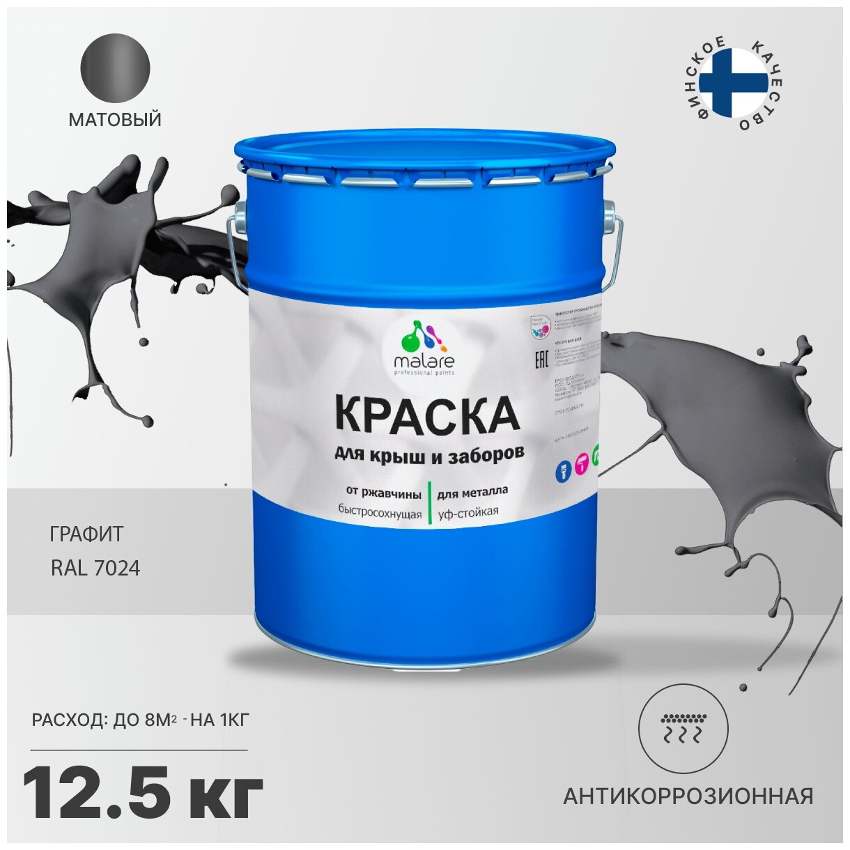 Купить Краска Malare для металлического забора, для крыши из металла, для металлочерепицы, антикоррозионная, быстросохнущая, матовый, графитово-серый(темный), 12,5 кг.