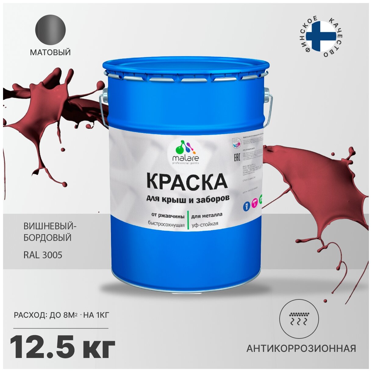 Купить Краска Malare для металлического забора, для крыши из металла, для металлочерепицы, антикоррозионная, быстросохнущая, матовый, вишнево-бордовый, 12,5 кг.