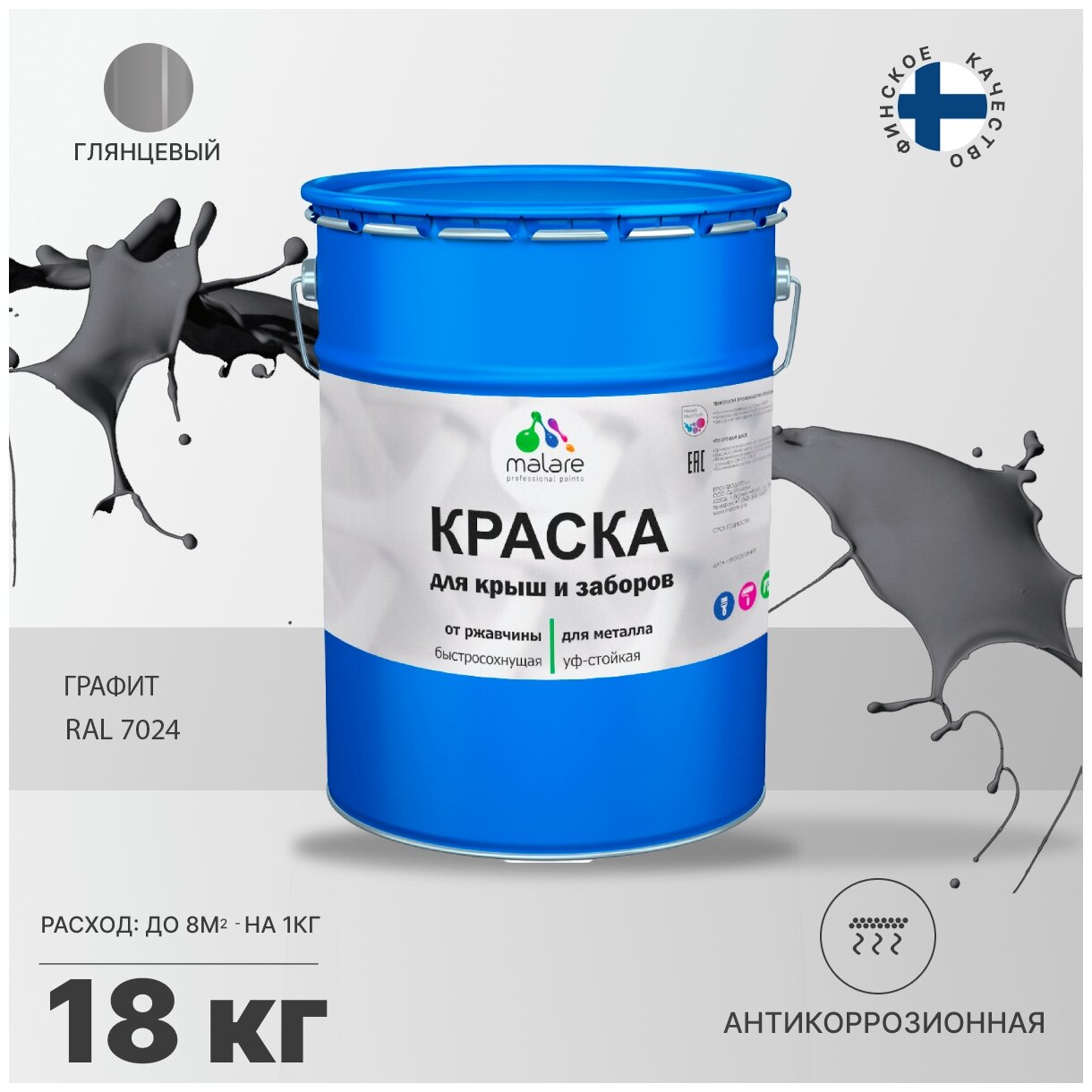 Купить Краска Malare для металлического забора, для крыши из металла, для металлочерепицы, антикоррозионная, быстросохнущая, глянцевый, графитово-серый(темный), 18 кг.