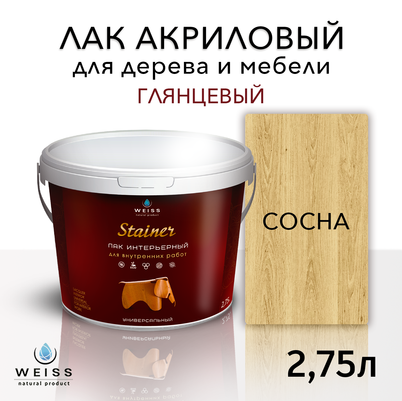 Лак для дерева акриловый сосна, глянцевый, Weiss natural product, без запаха, самовыравнивающийся, 2.75л
