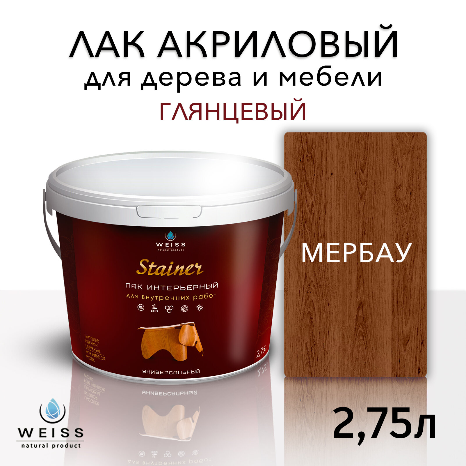 Лак для дерева акриловый венге, глянцевый, Weiss natural product, без запаха, самовыравнивающийся, 2.75л