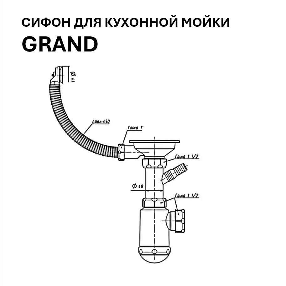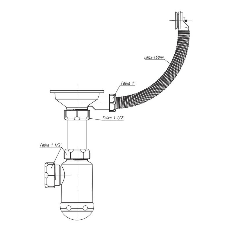 Сифон для мойки большая горловина с переливом, с отводом под сливной шланг и со съёмной корзинкой для мусора