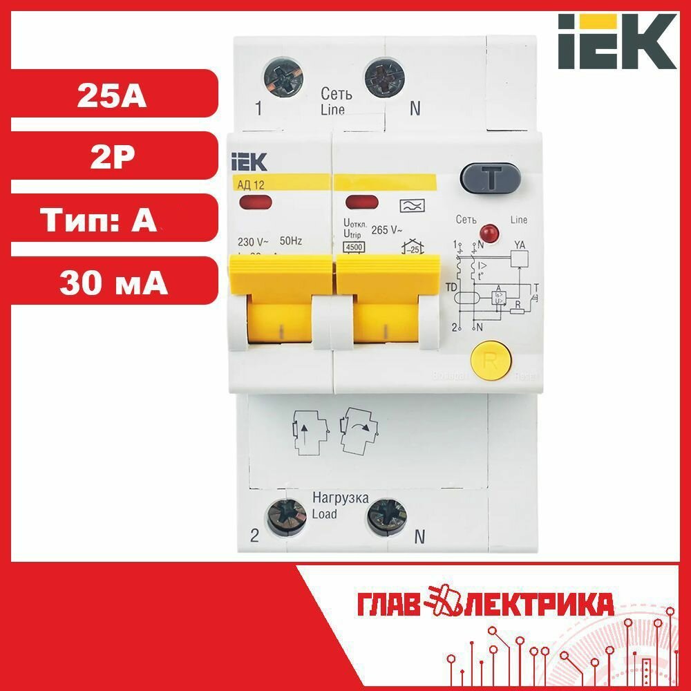 IEK дифф. автоматический выключатель АД12М 2P С25А 30мА ток утечки A, AC MAD12-2-025-C-030