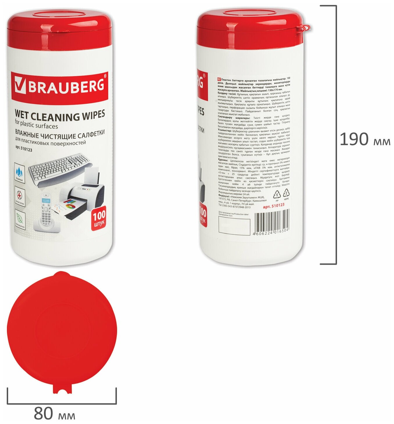 Салфетки для пластиковых поверхностей BRAUBERG, 13х17 см, туба 100 шт., влажные, 510123, 510123
