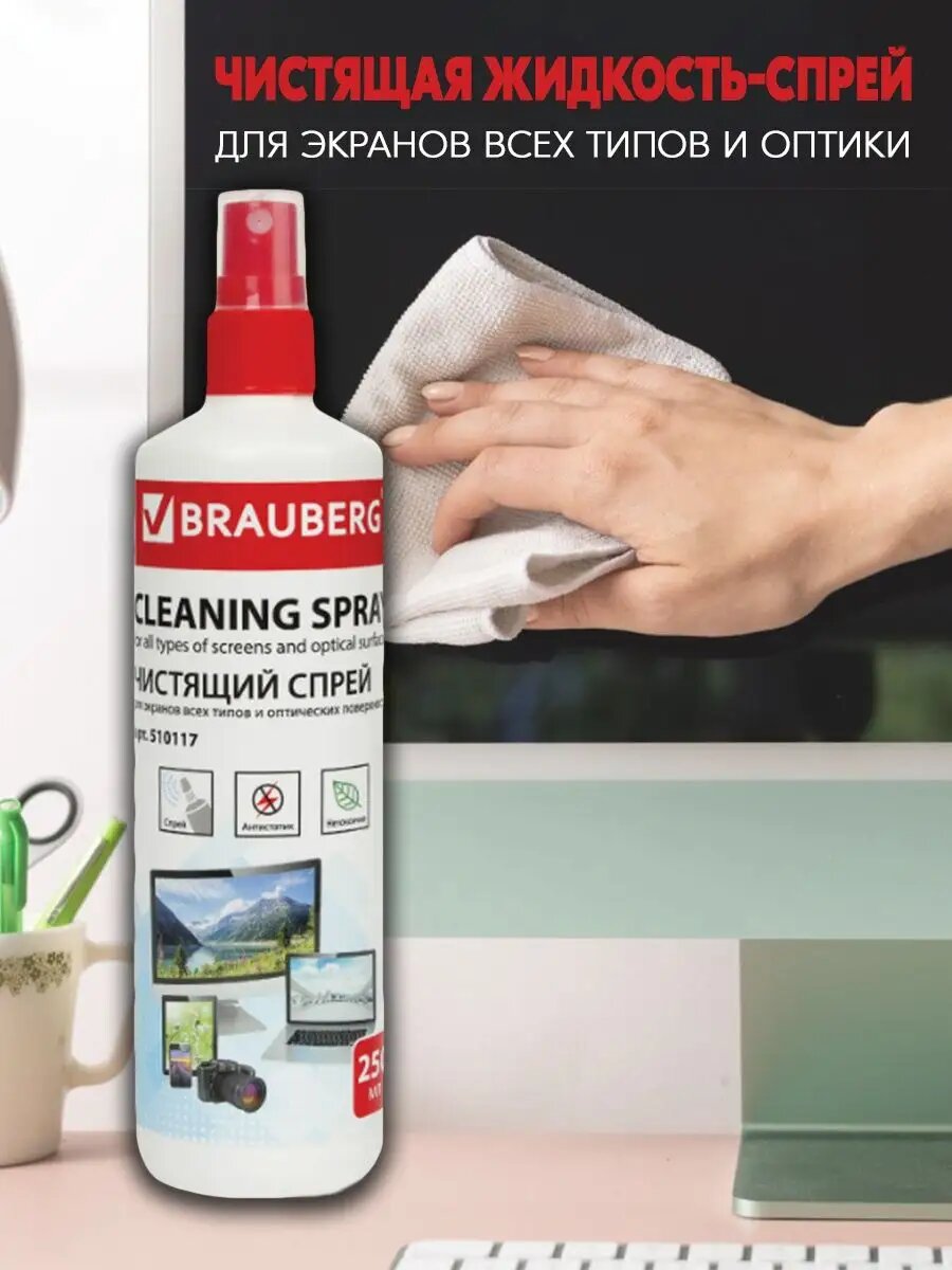СохранитьЧистящая жидкость-спрей BRAUBERG для экранов всех типов и оптики, универсальная, 250 мл, 510117 интересное: