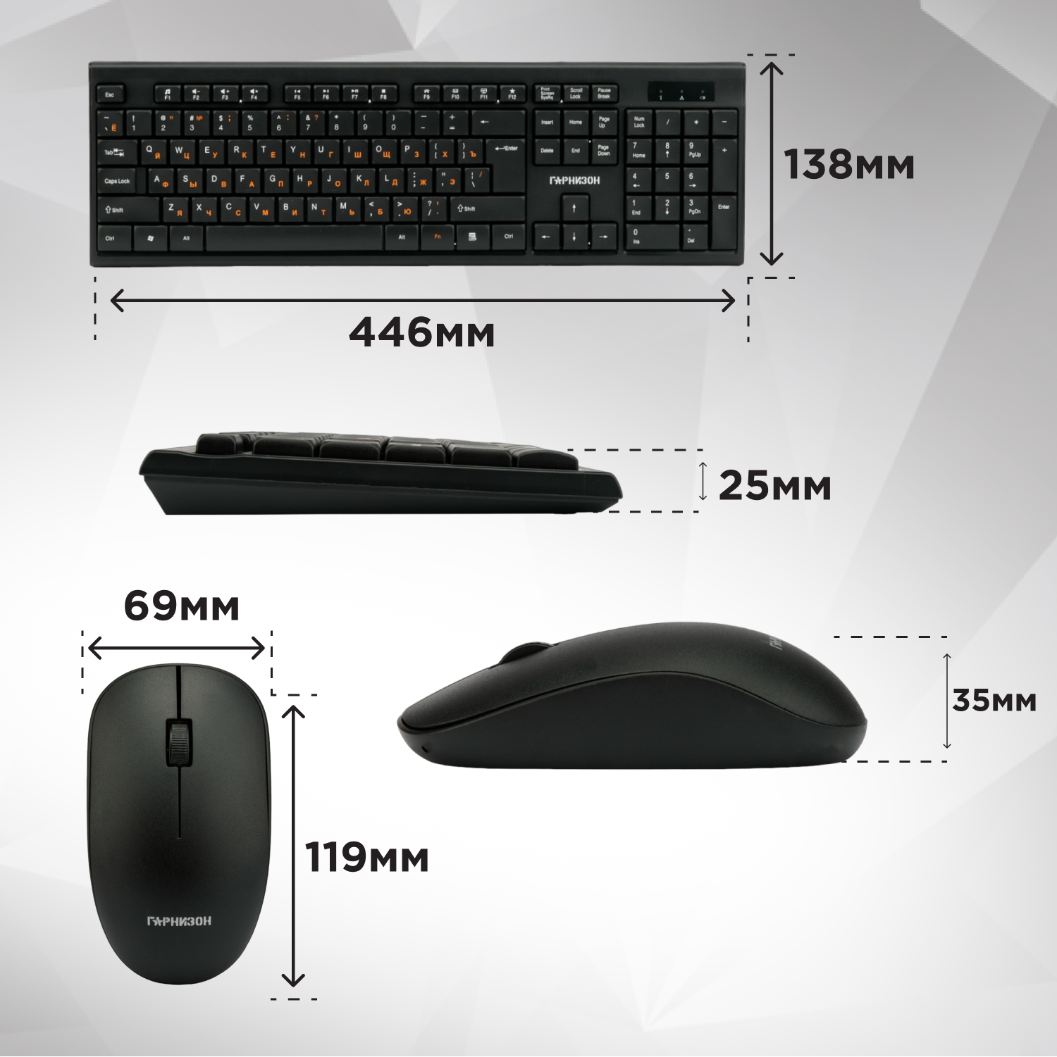 Комплект Гарнизон клавиатура + мышь GKS-150, беспроводная, бчерный, 2.4 ГГц, 1000 DPI, USB