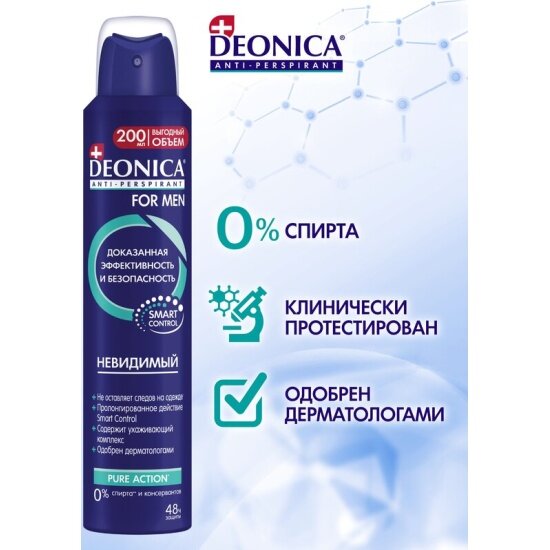 Дезодорант мужской антиперспирант Deonica for Men "Невидимый". Спрей, 200 мл. Не оставляет следов на одежде