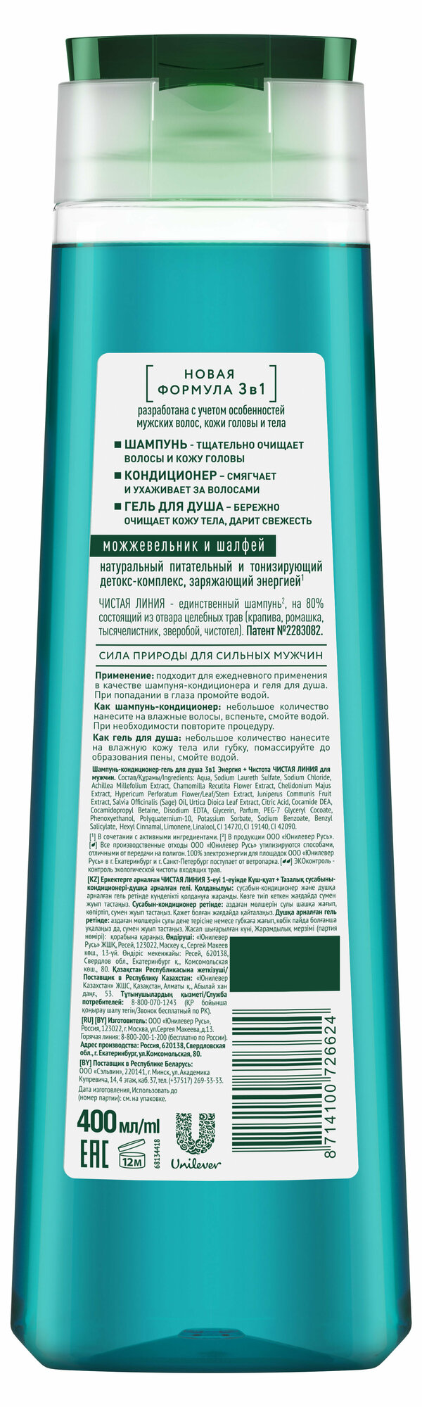 Unilever (Юнилевер) Шампунь-кондиционер и гель для душа 3в1 Чистая Линия For Men Энергия+Чистота 400 мл