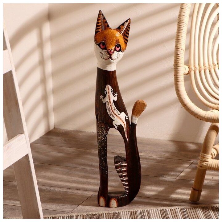 Сувенир дерево "Серая кошка в ошейнике с ящерками" 60х12х6 см