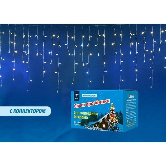 Бахрома светодиодная с эффектом мерцания Uniel ULD-B3010-200-TTK WARMWHITE-WHITE IP44 3м. Соединяемая. 200 светодиодов. Теплый белый свет. Провод прозрачный, UL-00003949