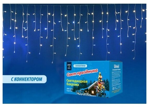 Бахрома светодиодная с эффектом мерцания Uniel ULD-B3010-200-TTK WARMWHITE-WHITE IP44 3м. Соединяемая. 200 светодиодов. Теплый белый свет. Провод прозрачный, UL-00003949