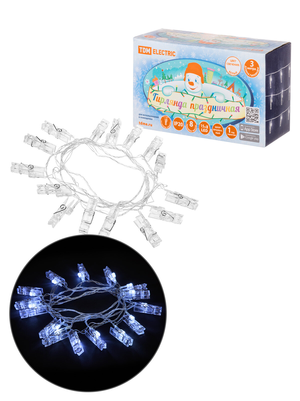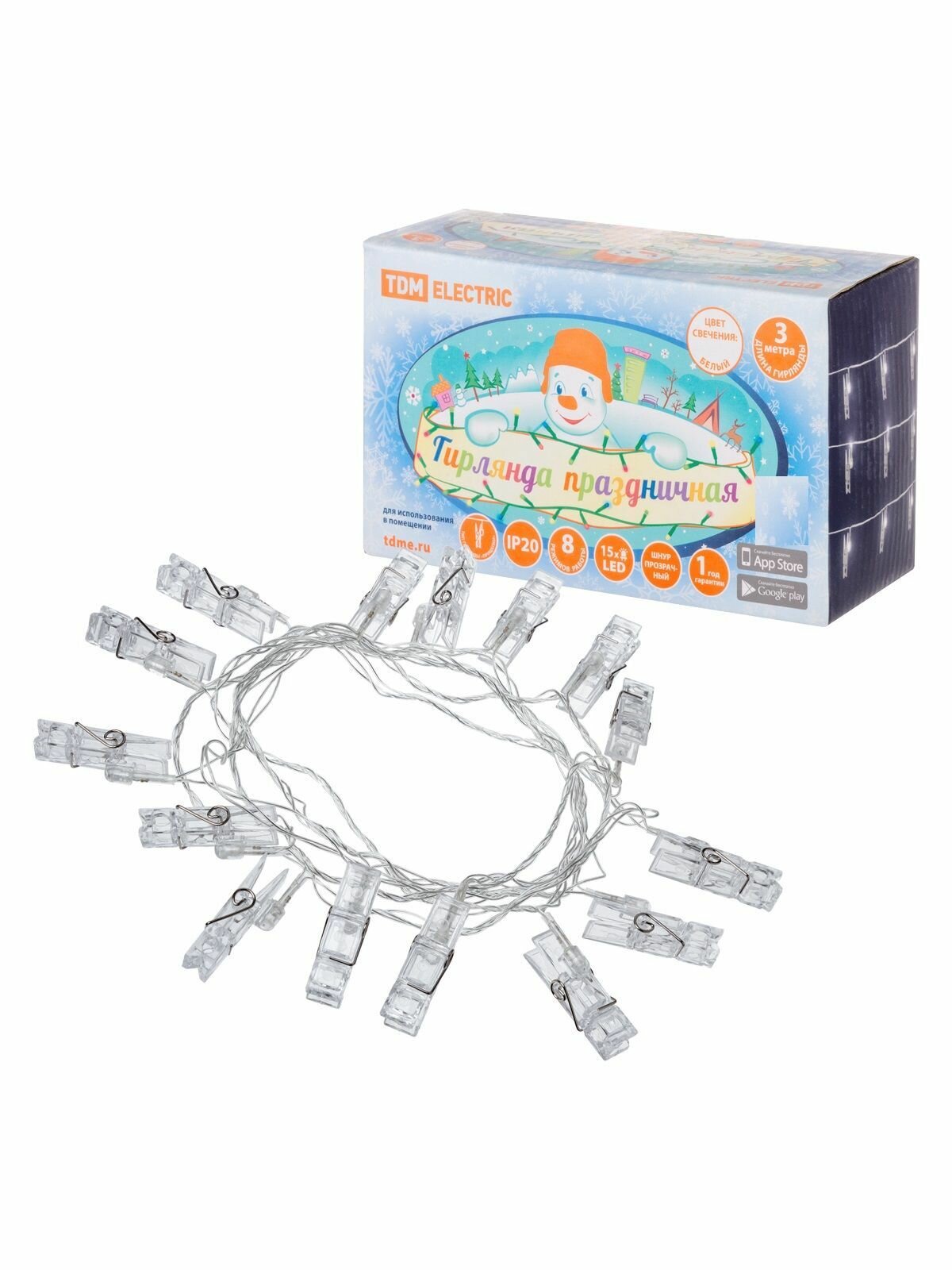 Купить Гирлянда светодиодная "Прищепки" 3 м, 15LED, белый, 8 режимов, 250 В, IP20, TDM