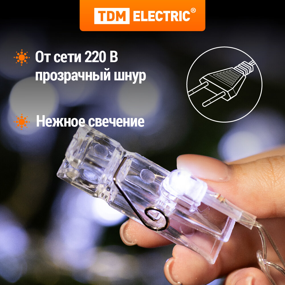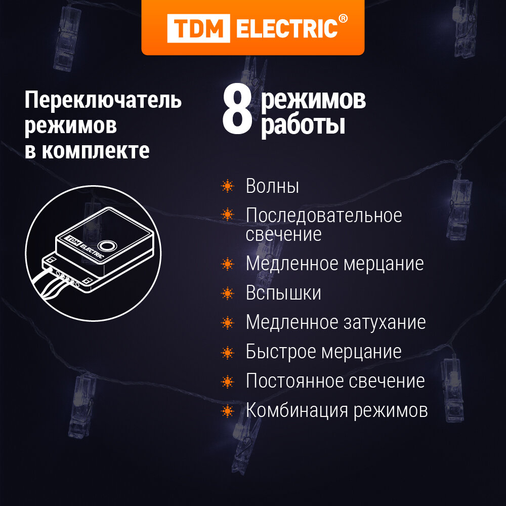 Светодиодная гирлянда TDM Прищепки, 3 м, 15LED, белый, 8 режимов, 250 В, IP20 SQ0361-0093