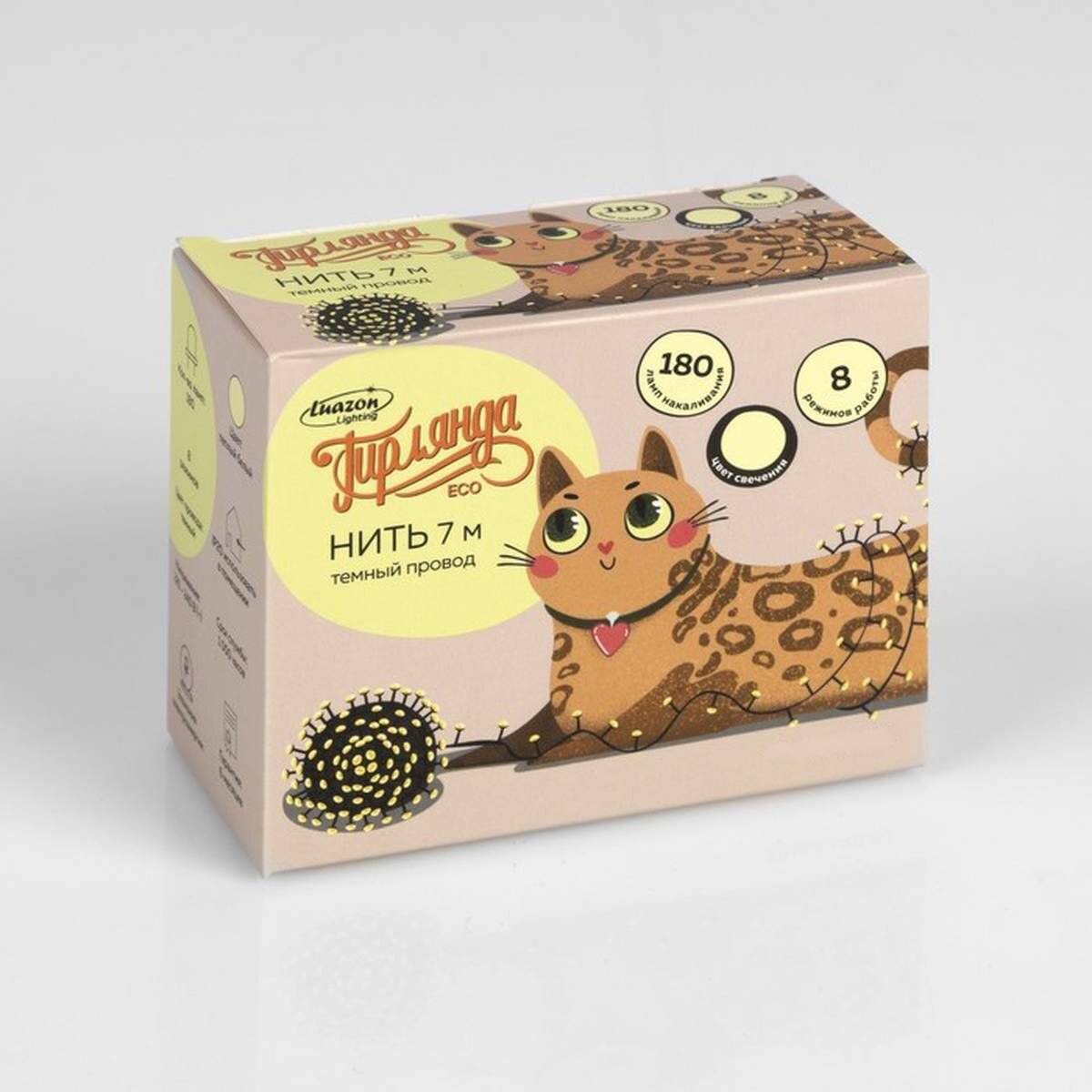 Luazon Lighting Гирлянда «Нить» 7 м, IP20, тёмная нить, 180 ламп, свечение тёплое белое, 8 режимов, 220 В