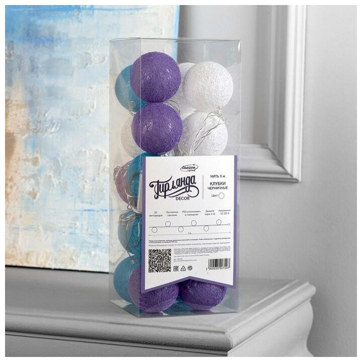 Гирлянда "Нить" 5 м с насадками "Клубки черничные", IP20, прозрачная нить, 20 LED, свечение белое, 220 В интересное: