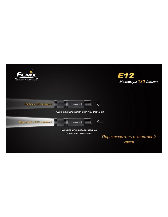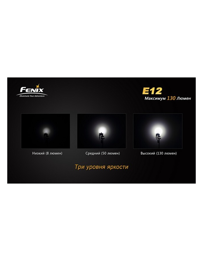 Для модели Fenix E12 был выбран надежный американский светодиод Cree XP-E2. Он обеспечивает фонарю яркость от 8 до 130 люмен и в состоянии прослужить не менее 50 000 ч Рекомендую к покупке! |