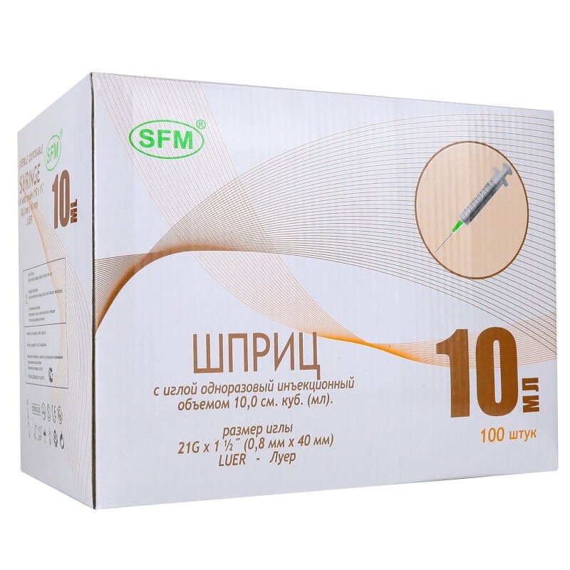 Купить Шприц двухкомпонентный одноразовый инъекционный SFM с иглой (10 мл, 21G (0,80х40 мм), 100 шт, Luer)