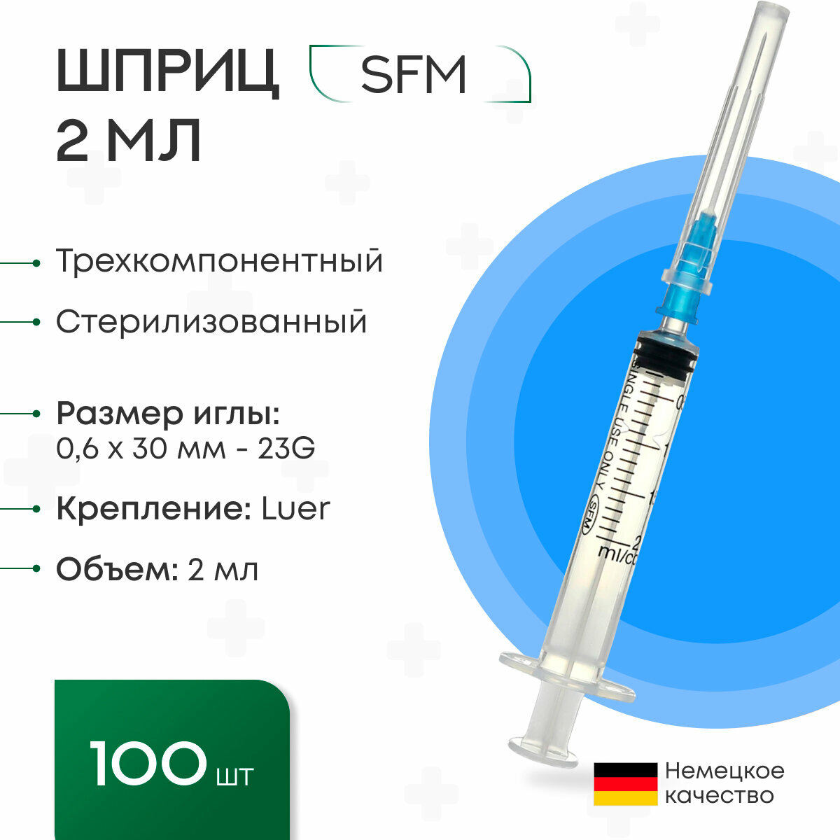 Шприц трехкомпонентный одноразовый инъекционный SFM с иглой (2 мл, 23G (0,60х30 мм), 100 шт, Luer)