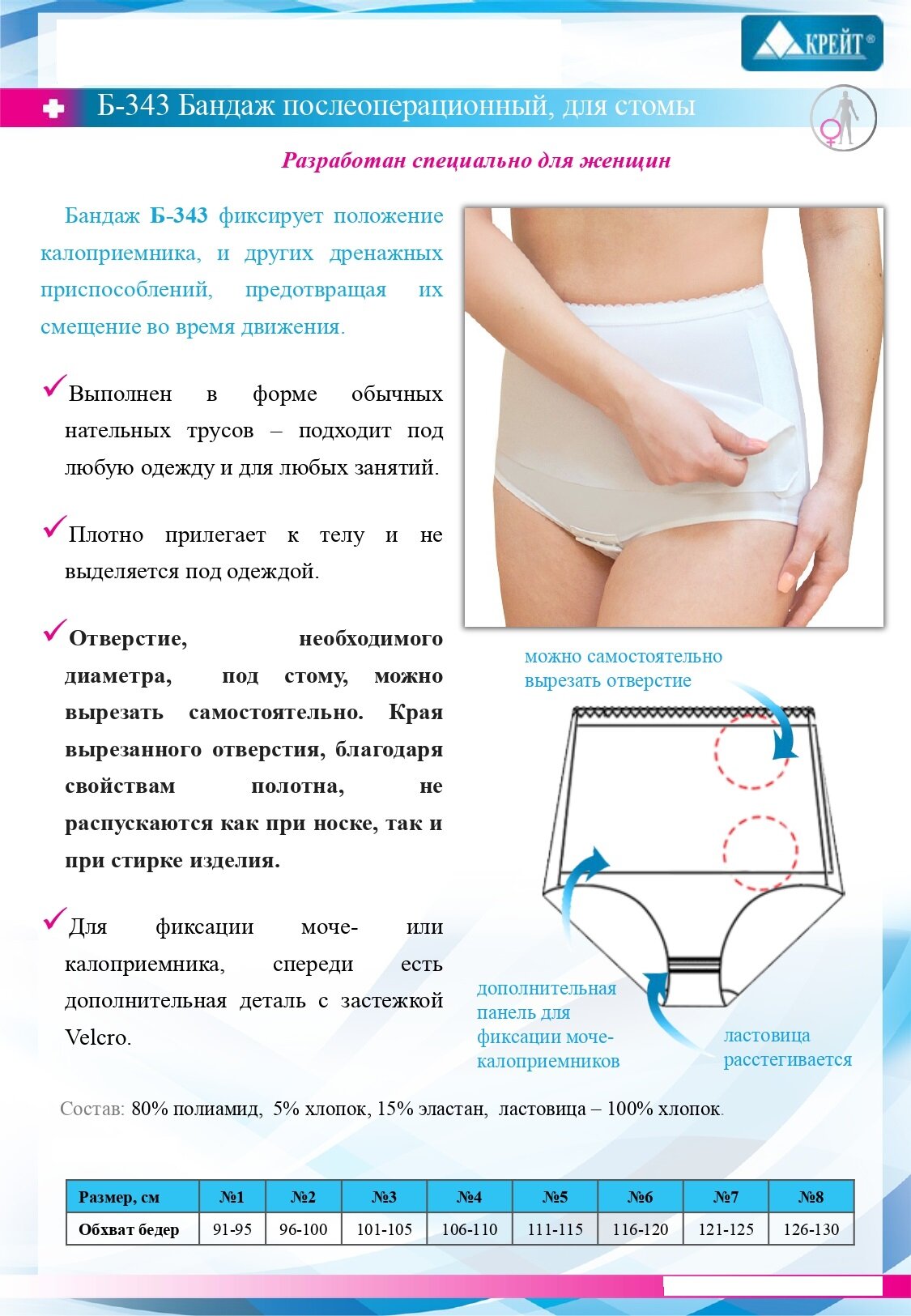 | Минусы: | К сожалению, это больше подходит для стройных людей. В моем случае, я покупала маме, она гиперстеник и высота этих трусов -бандажа не достигает пупочного кольца. А на картинке ,бандаж позиционируется как высокие трусы. В результате для полных людей с колостомой он не совсем удобен. |