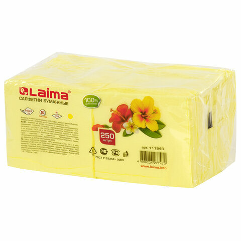 Салфетки бумажные 250 шт., комплект 5 шт., 24х24 см, LAIMA/лайма, желтые (пастельный цвет), 100% целлюлоза, 111948 интересное: