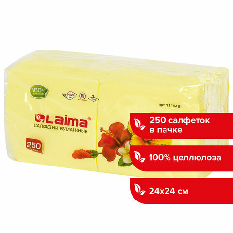 Купить Салфетки бумажные 250 шт., комплект 5 шт., 24х24 см, LAIMA/лайма, желтые (пастельный цвет), 100% целлюлоза, 111948