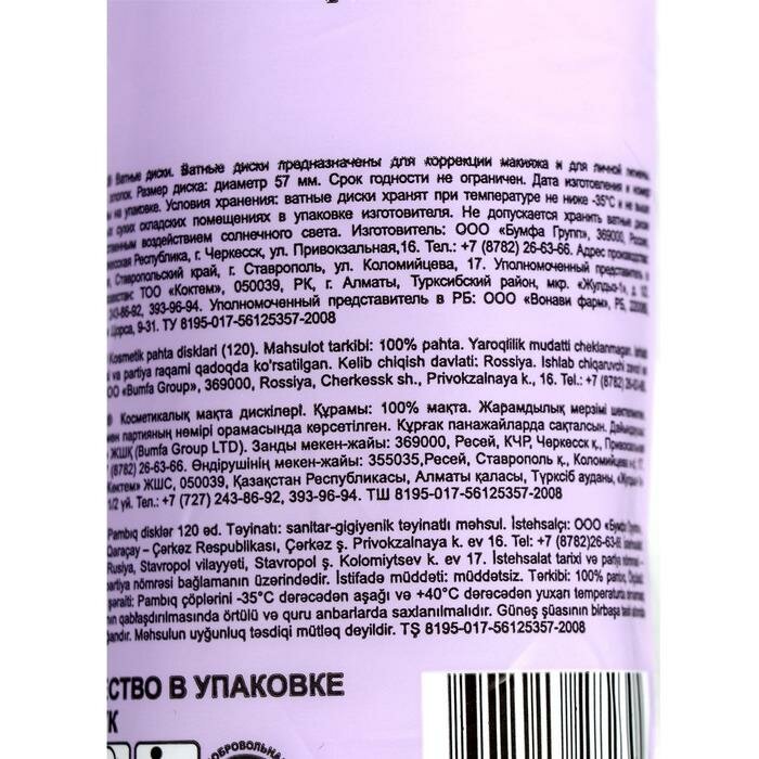 Ватные диски Premial Classic косметические с прошитыми краями, 120 шт., пакет