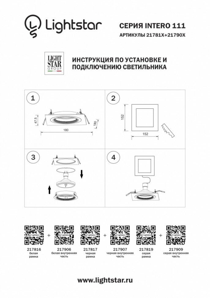 Типы/Светильники/Встраиваемые Lightstar Рамка Lightstar Intero 111 217817