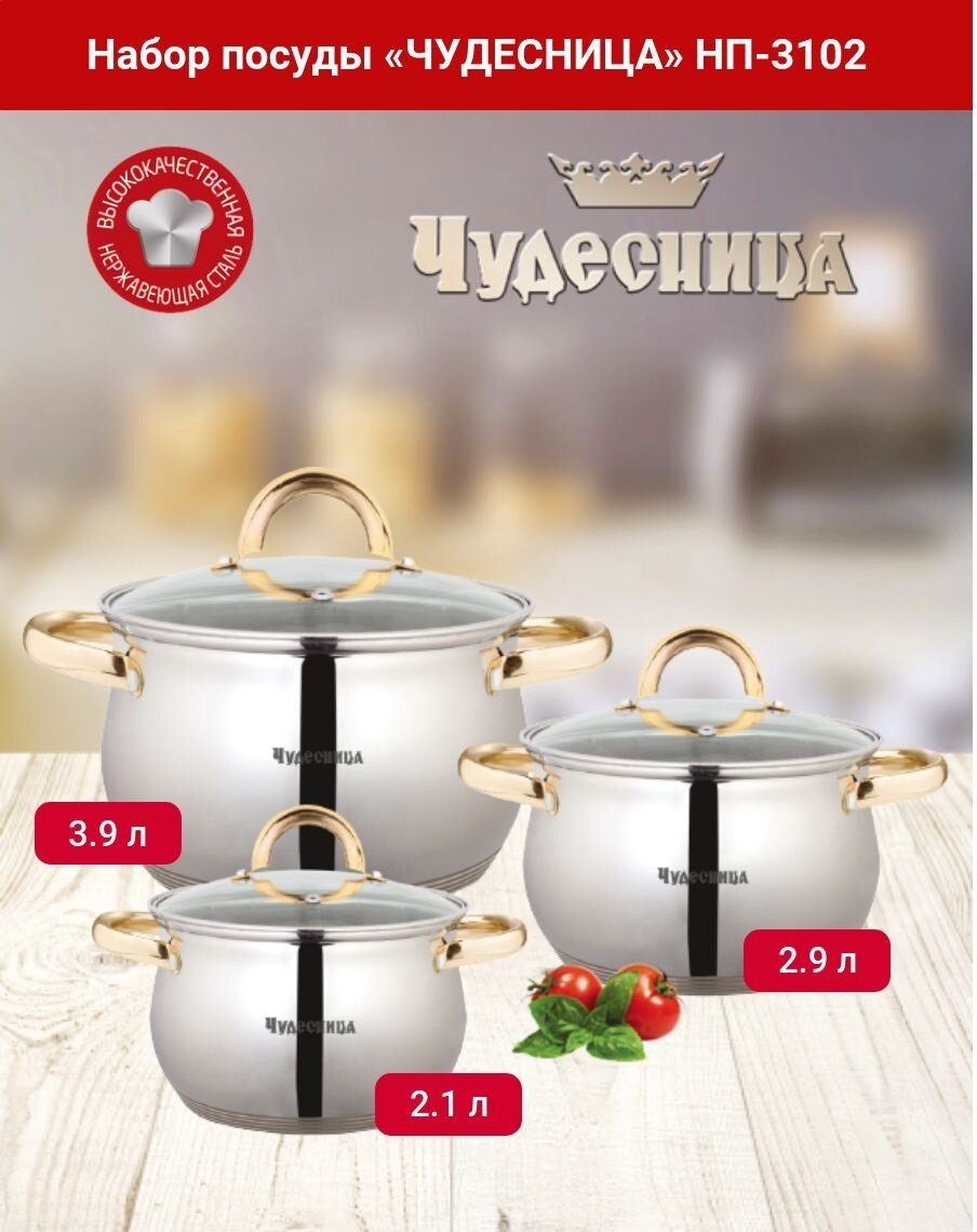 Ниже Вы можете прочитать отзывы на Набор кастрюль Чудесница НП-3102 из нержавеющей стали, 6 предметов, ознакомится с подробными характеристиками, посмотреть интересные обзоры и фотографии на Набор кастрюль Чудесница НП-3102 из нержавеющей стали, 6 предметов.