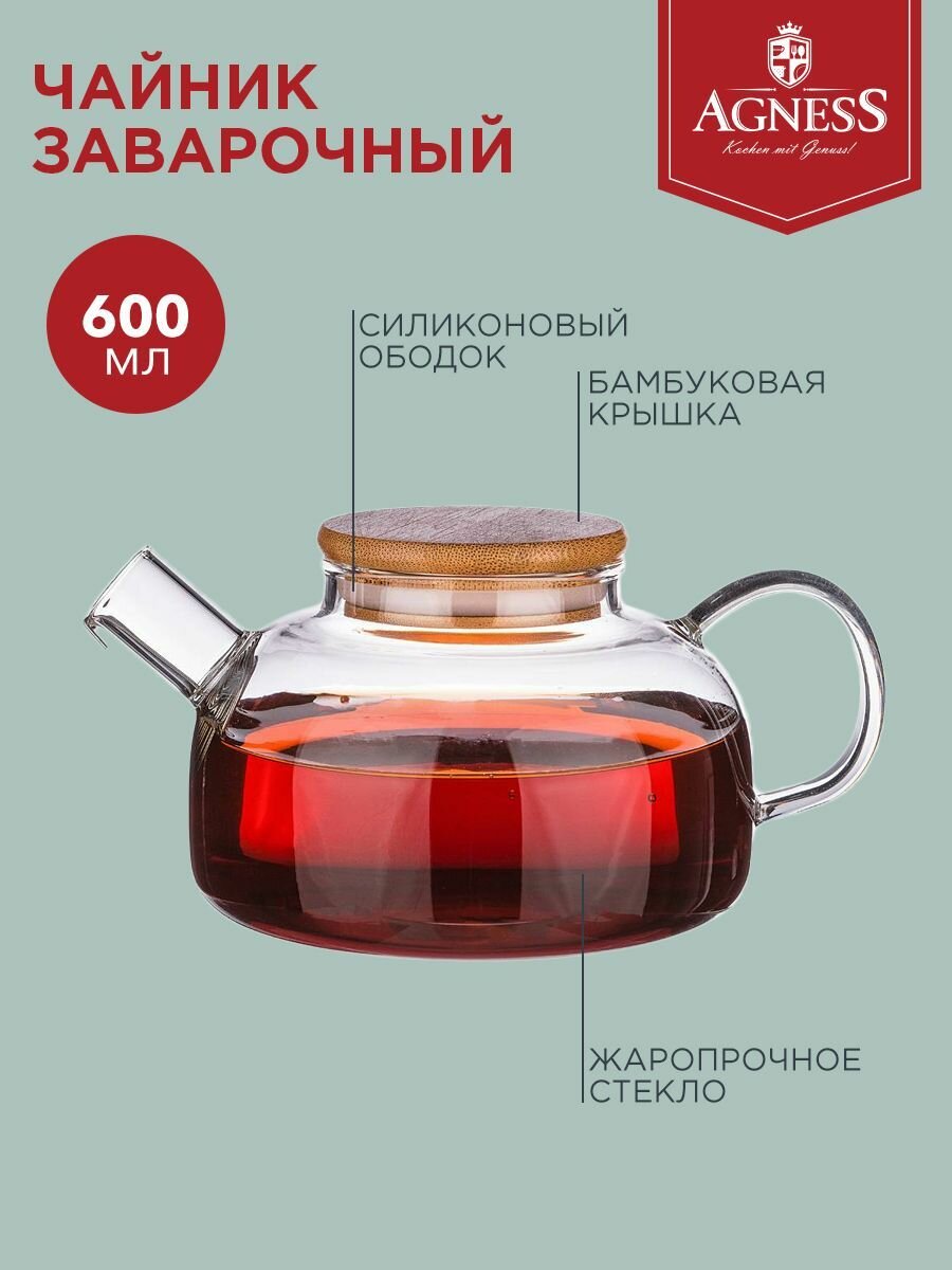 Чайник заварочный прозрачный Agness с бамбуковой крышкой, 600 мл, стекло