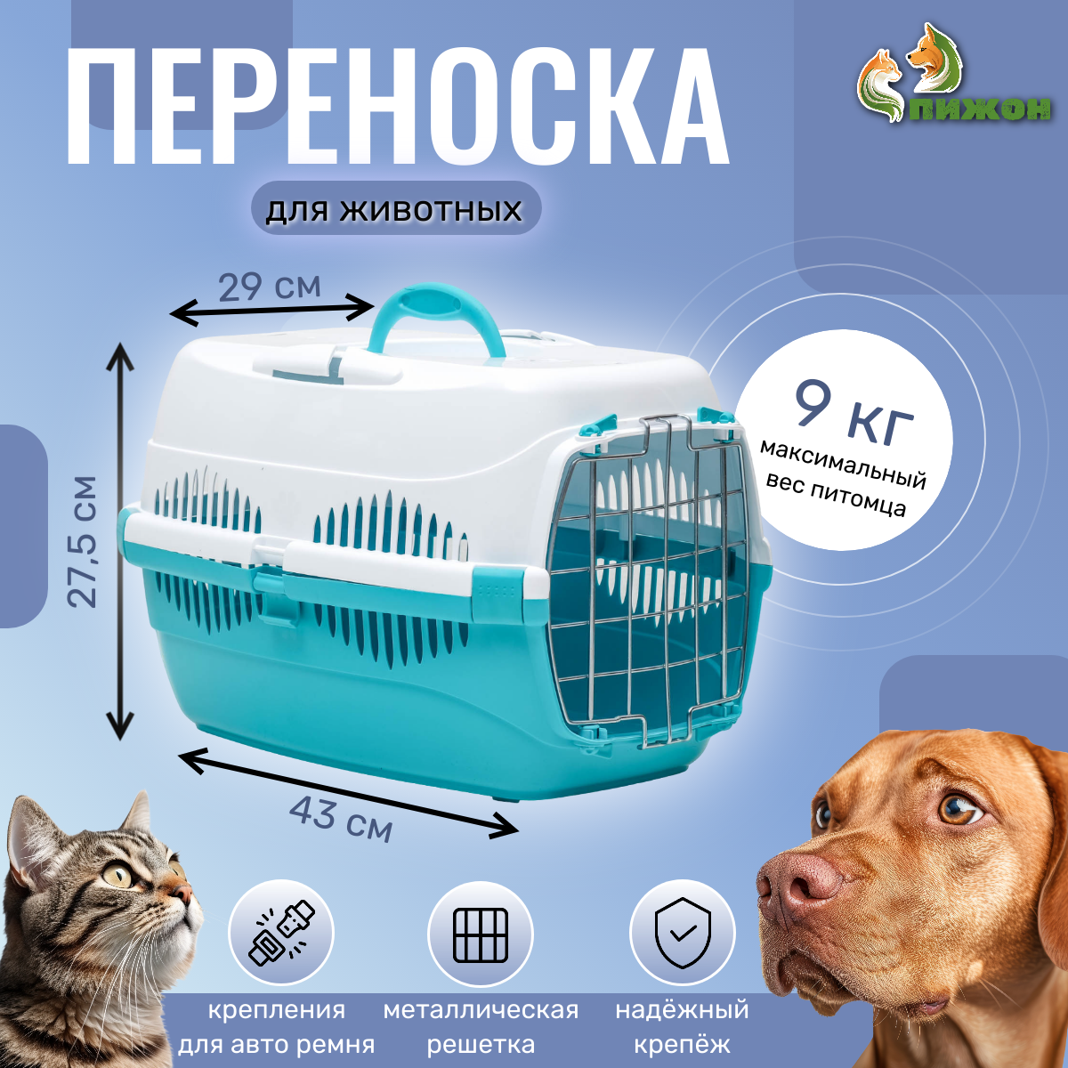 Переноска для животных Пижон до 9 кг, металлическая дверь, 43х29х27,5 см, бело-бирюзовая