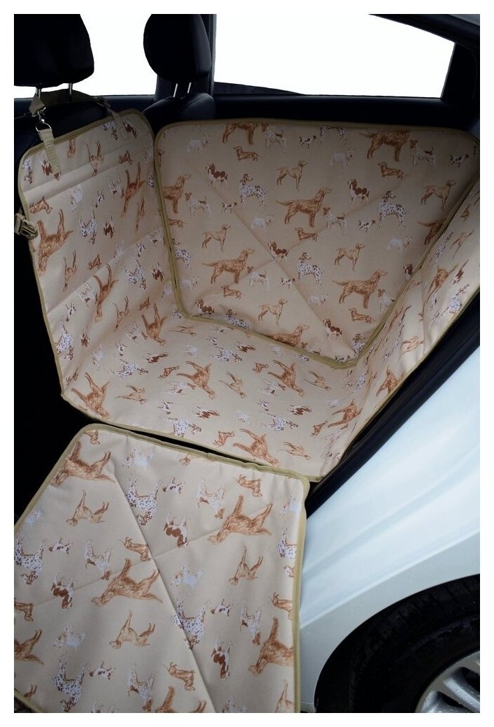 Автогамак для перевозки собак Happy Dog (Хэппи Дог). На 1/3 заднего сиденья. Цвет: собаки на бежевом фоне.