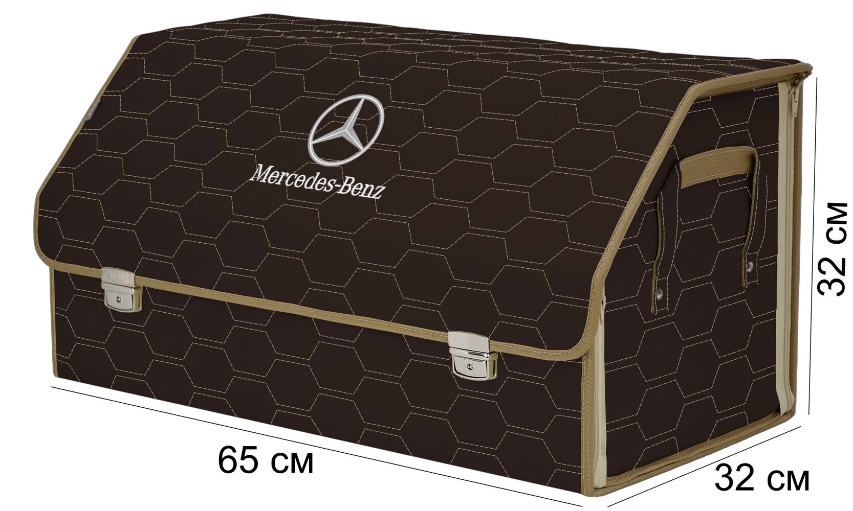 Купить Органайзер-саквояж в багажник "Союз Премиум" (размер XL Plus). Цвет: коричневый с бежевой прострочкой Соты и вышивкой Mercedes (Мерседес).