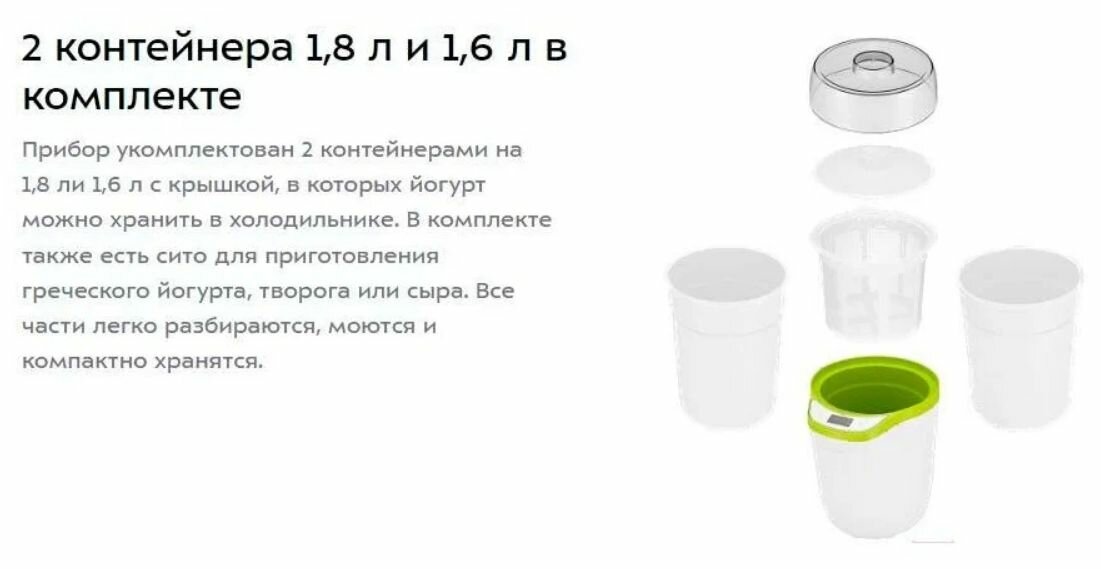 ? Простота использования и ухода после. ? Инструкция понадобится только 1 раз и то для тех кто впервые будет готовить йогурты. ? Внешний вид. Отлично впишется в яркую кухню. ? Готовит правильно, не перегревает. ? Объем как раз для литрового пакета молока. |