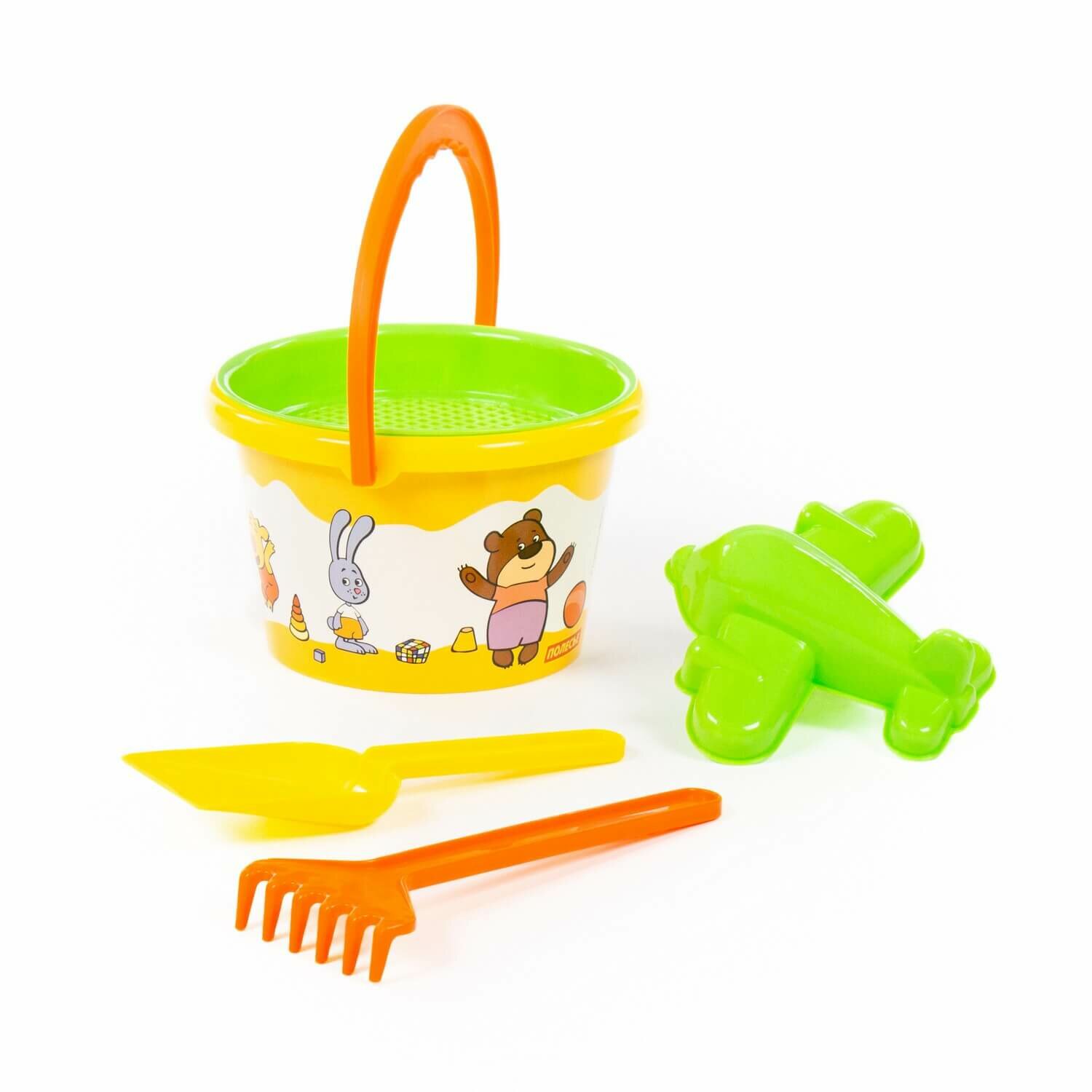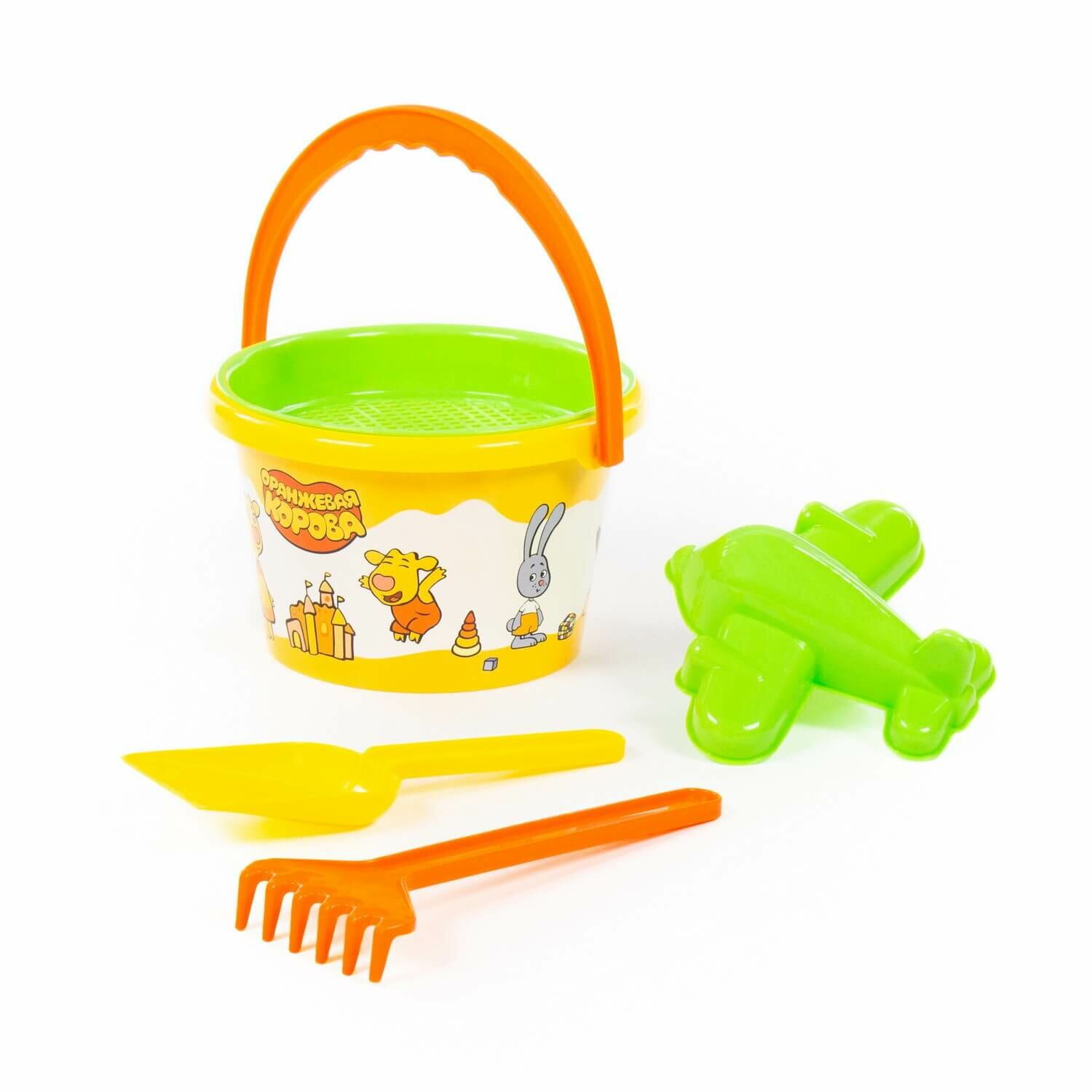 Набор для песочницы Полесье Оранжевая корова №3: ведро среднее с наклейкой,ситечко,лопатка,грабельки,формочка, 83173 интересное: