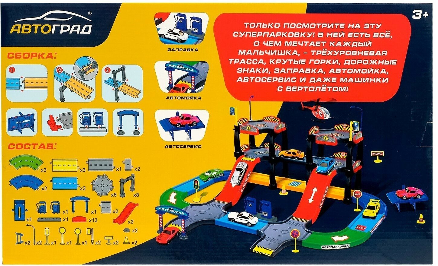 Гараж Мегапаркинг, 2 металлические машины, 1 вертолёт, аксессуары Автоград 1077187 .