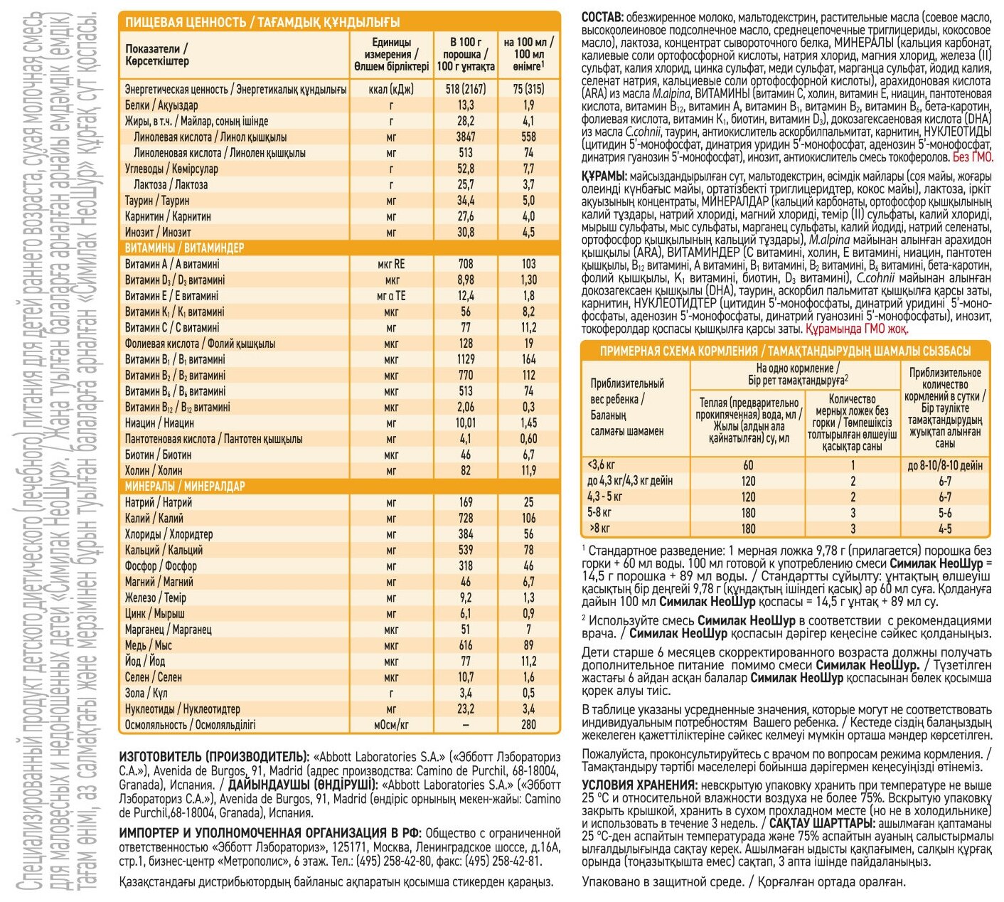 Симилак Неошур содержит нужное количество калорий, витаминов и минералов, благодаря чему ребенок хорошо набирает вес и получает все необходимые витамины.